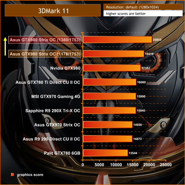 After manually overclocking the Asus GTX980 Strix OC the increase in performance was very noticeable. We almost hit 21,000 points in the graphics test of 3DMark 11 – our highest yet for a single GPU.
