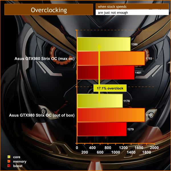 The reference Nvidia GTX980 exhibited a lot of headroom, but the ASUS GTX980 Strix OC almost hit a boost speed of 1,500mhz! These video cards are clocked high out of the box, but our specific sample had another 17.1% available.