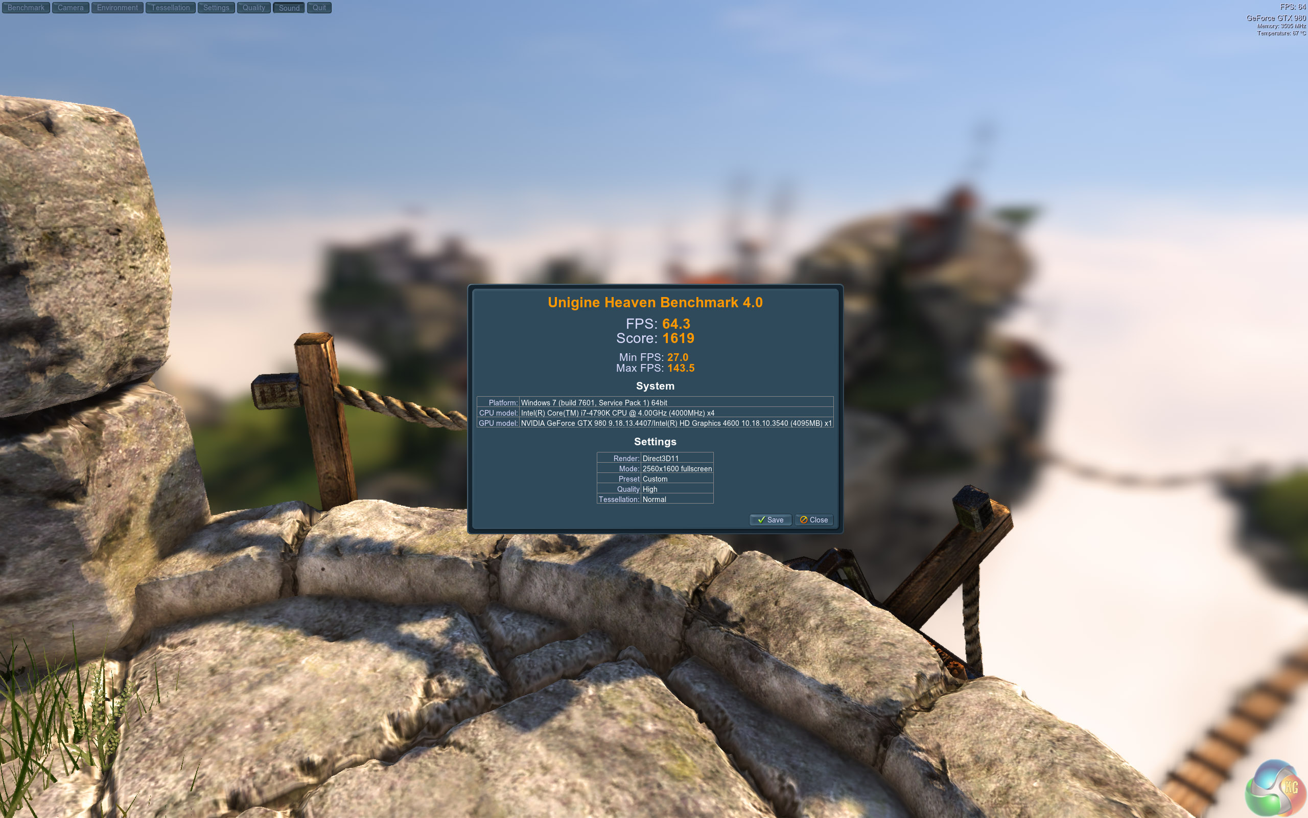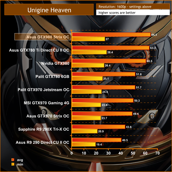Nvidia hardware scores well in this tessellation heavy benchmark. The Asus GTX980 Strix OC takes the top position, averaging 64.3 frames per second.