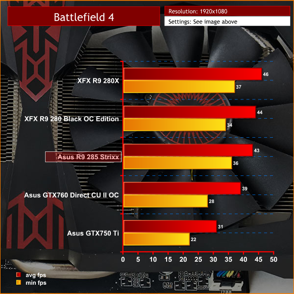 A demanding engine, but the R9 280 and R9 285 are able to hold very smooth frame rates. The GTX760 OC is a little slower, although it is still able to power the game without a problem.