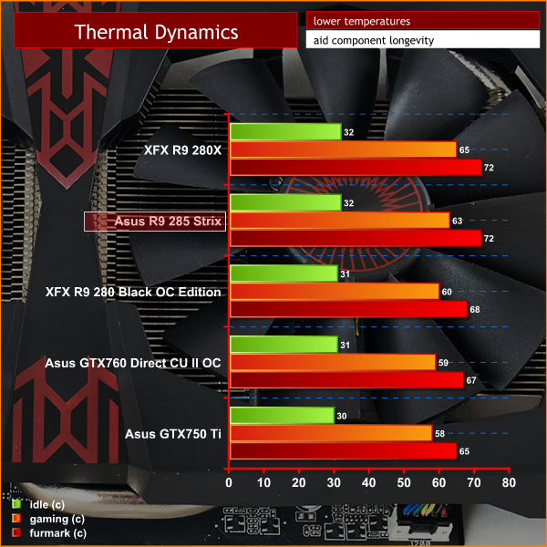 The Strix cooler on the R9 285 doesn't activate until load temperatures hit around 55c. The fans spin very slowly (sometimes registering only 200 rpm). At 58c load they begin to spin up to maintain the default thermal curve. By 60c they are spinning at 1,300 rpm. When gaming – the fans spin around 1,700 rpm to hold a temperature around 63c.