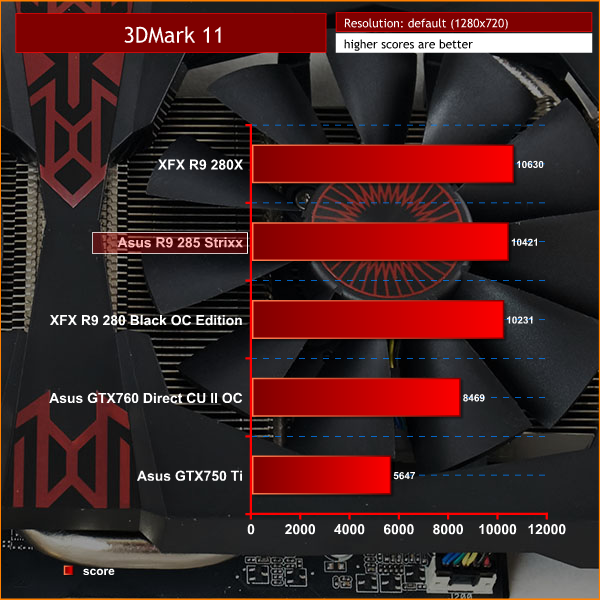 The graphics score of 10,421 points places the R9 285 very close next to the R9 280 Black OC Edition, although the R9 285 holds a small performance edge. The R9 280X claims top spot with a score of 10,630 points.
