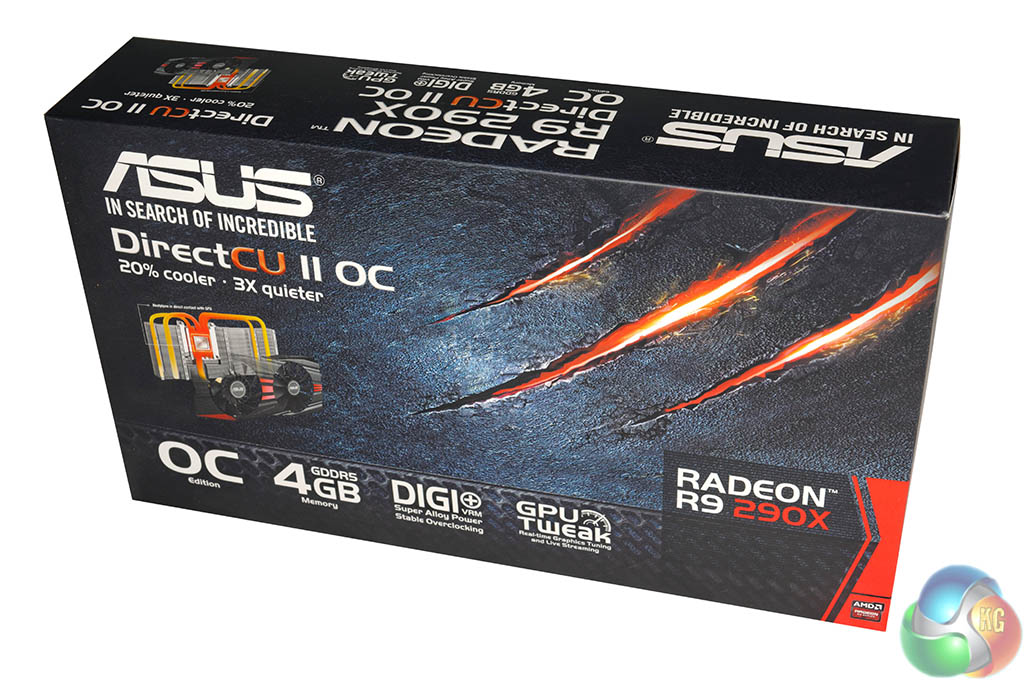 The Asus R9 290X Direct CU II OC ships in a familiar looking box featuring red claw marks.
