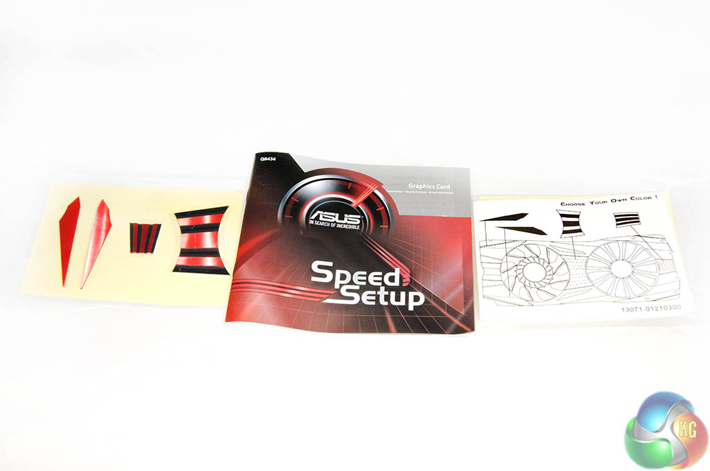 ASUS supply these stickers to let the end user customise the appearance of their card, allowing them to match the colours of the motherboard. Only useful if your motherboard has red or gold heatsinks. That said, you could just leave it plain black, like we did in this review.