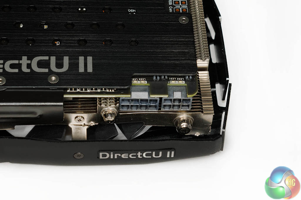 The Asus R9 290X Direct CU II OC takes power from an 8 pin and a 6 pin power connector. This is identical to the reference design.