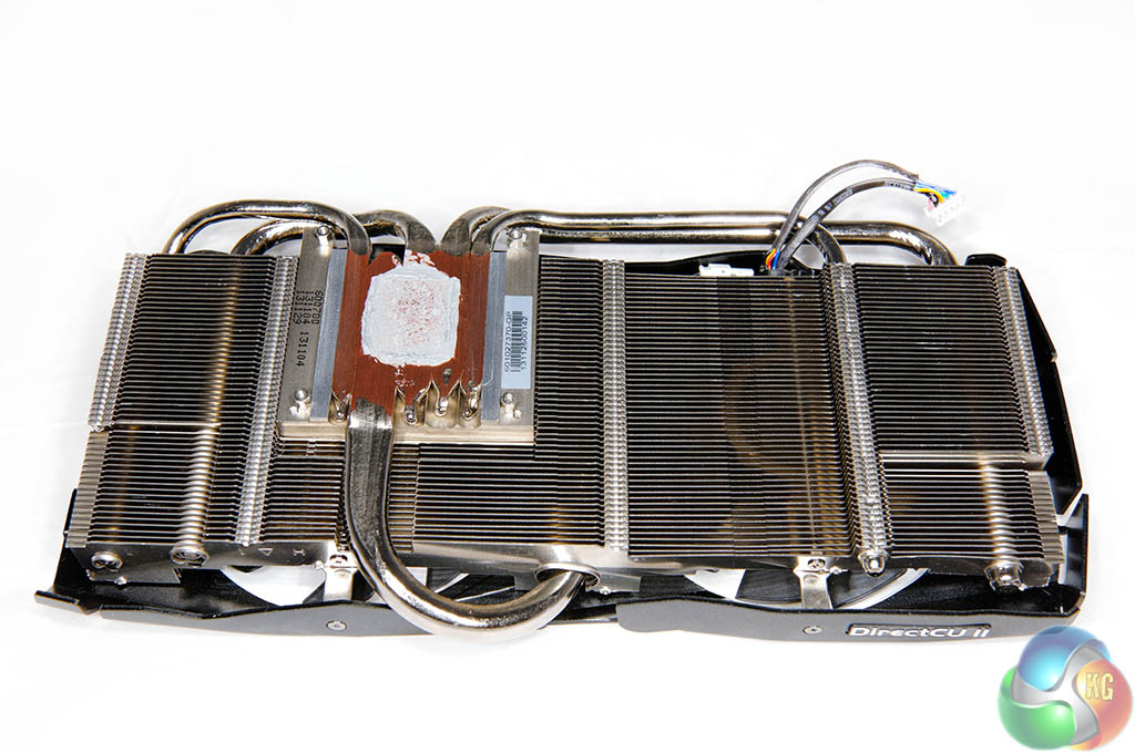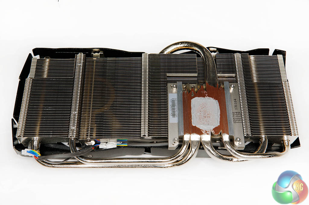 Above, the Asus R9 290X Direct CU II OC disassembled. It is an unusual design – there are five direct touch nickel plated heatpipes which run into the base. Four of the thinner heatpipes run along one side into the two separate racks of aluminum fins. A single, very thick double width heatpipe runs in the opposite direction into the main rack of fins.