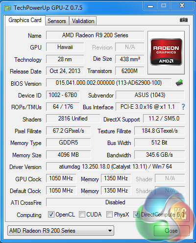 An overview of the Asus R9 290x Direct CU II OC. The Hawaii CPU is built on the 28nm process and has 64 ROPS, 176 Texture units, and 2816 Stream processors. The 4GB of GDDR5 memory is connected via a wide 512 bit memory interface. Asus have overclocked the memory from 1,250mhz to 1,350mhz (from 5Gbps effective to 5.4Gbps effective), and the core receives a boost from 1,000mhz to 1,050mhz.