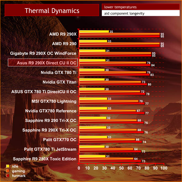 There is no doubt that the Sapphire R9 290X Tri-X OC has the advantage so far over all the other partner boards … holding the lowest load temperature of 68c when gaming. The Asus R9 290X Direct CU II OC holds a temperature of 79c under load with the companies default fan profile.