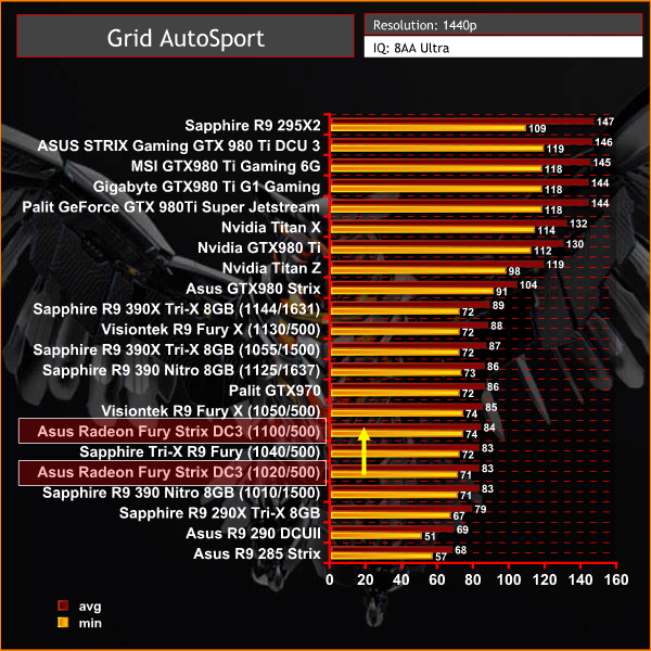 The Asus Fury is able to maintain a frame rate above 60 at all times, meaning perfectly smooth playback. When we compare against other solutions, we can see the card is underperforming a little at 1440p.