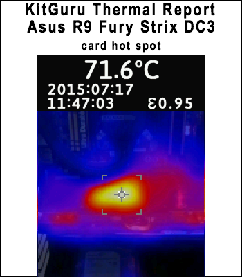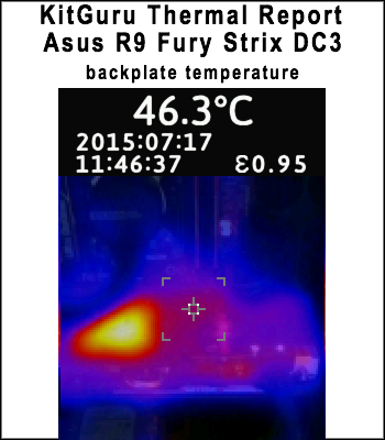 We took a recording after 30 minutes of gaming in Witcher 3. The backplate on the R9 Fury helps to spread heat evenly across the full length of the PCB. Under extended load temperatures range between 43c and 48c. We took a recording after 30 minutes of gaming in Witcher 3.