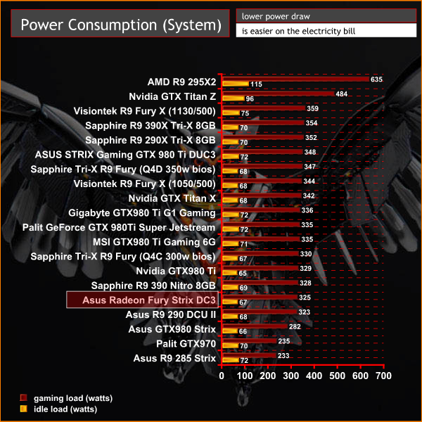 Under gaming load, the Asus Radeon R9 Fury Strix DC3 OC consumes around 325 watts of power, which is around 5 watts less than the Sapphire Tri-X R9 Fury card.