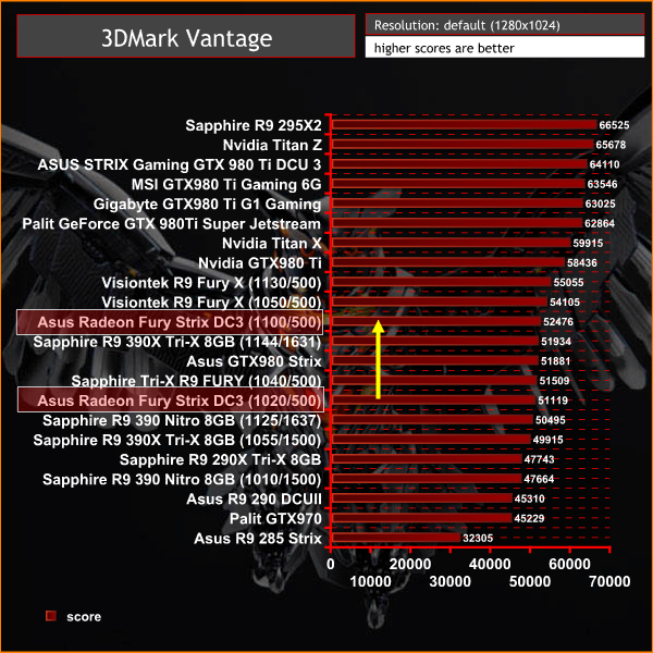The default scores are quite good, indicating strong performance with older Direct X 10 titles. When manually overclocked to 1,100mhz the scores increase – slotting in just behind the reference clocked Fury X.