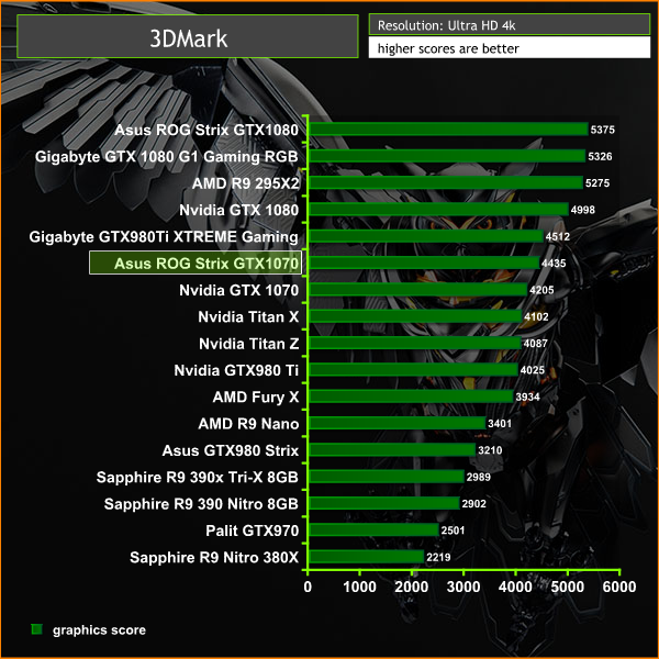 The Asus Republic Of Gamers Strix GTX 1070 scores well in the newer Direct X 11 benchmark from Futuremark. The 4K score of 4,435 points is very closely behind the Gigabyte GTX980 Ti XTREME gaming card (4512).