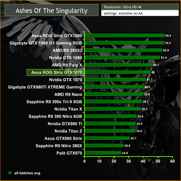 At Ultra HD 4K the Asus Republic Of Gamers Strix GTX 1070 falls around a frame per second behind the AMD R9 Fury X at reference clock speeds. This overclocked card averages around 3 frames faster than the GTX1070 Founders Edition.