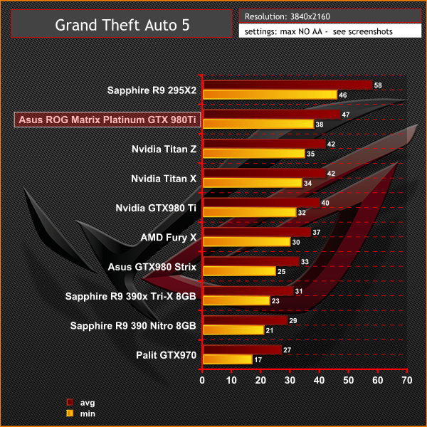 The Asus ROG Matrix GTX 980Ti Platinum Edition maintains an average close to 50 frames per second at Ultra HD 4K at these settings. This is 5 frames per second ahead of the Nvidia Titan Z.