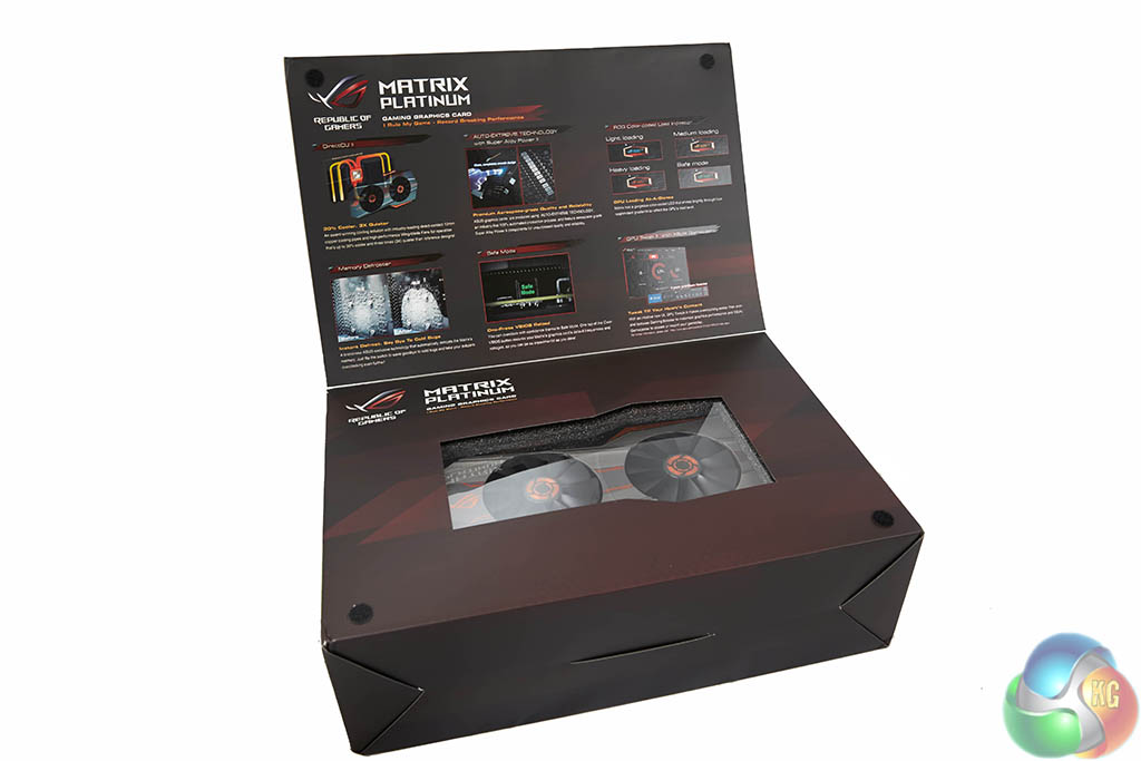 If you happen to stumble upon one of these in a retail store then you can open the box up, gatefold style – just be aware the shop owner will likely be watching you carefully. Asus detail the lighting on the card, the Super Alloy Power ‘Extreme Technology', the cooler, safe mode, and the memory defroster option. They also highlight their custom overclocking and tweaking software called ‘GPU Tweak II'.