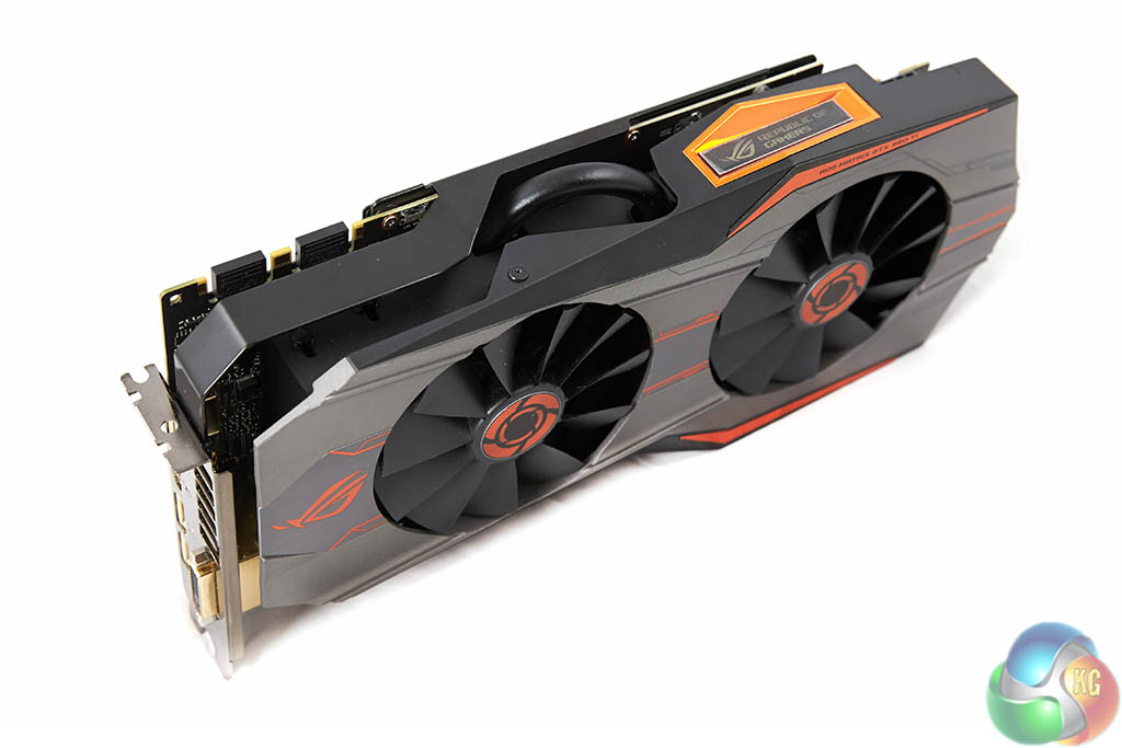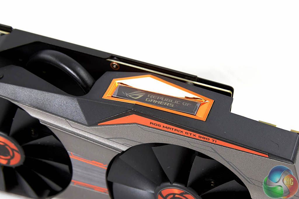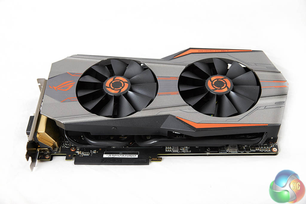 The Asus ROG Matrix GTX 980Ti Platinum Edition is a hefty 2.5 slot design. Two large fans reside inside a metal cooling system – which is effectively coloured silver/grey with orange accenting. It is actually one of the prettiest high end graphics cards that Asus have ever produced. Feel free to disagree.