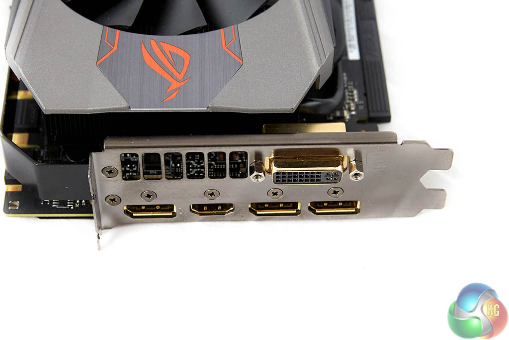 The ASUS card ships with a single DVI-D port. There are three DisplayPorts 1.2 and a single HDMI 2.0 port along the bottom of the I/O plate. If you wish, you can use all these ports at the same time for triple monitor gaming. HDMI 2.0 is supported, so you are able to get 60hz at 4K resolutions, without the need for any adapters.