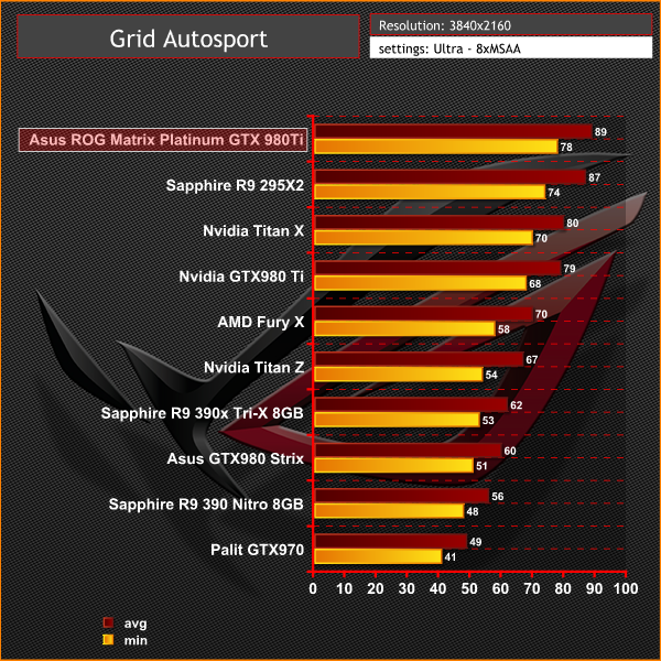 Performance at Ultra HD 4k is class leading and thanks to the hefty overclock on the core, the Asus ROG Matrix GTX 980Ti Platinum Edition tops the chart.