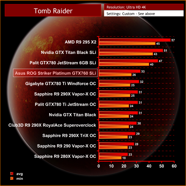A tough test for any graphics configuration. The Asus ROG Striker Platinum GTX760 cards manage to maintain an average of 33 frames per second while holding above the playable marker of 25 at all times.