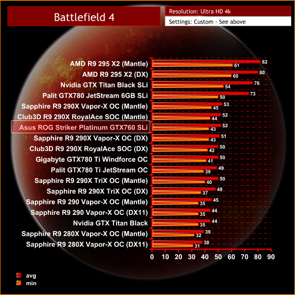 We drop the image quality settings a little at Ultra HD 4K, because the only card that can handle that level of IQ is the R9 295 X2. Frame rates from the Asus ROG Striker Platinum GTX760 in Sli are very impressive.