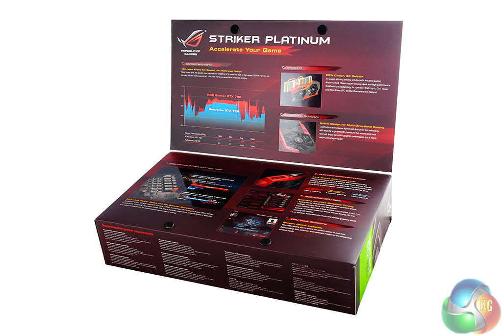 The Asus ROG Striker Platinum GTX760 graphics cards arrive in a traditionally styled Republic Of Gamers box, with the product name and some details highlighted.