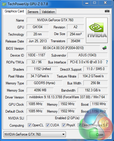 An overview of the hardware in the latest version of GPU. The Asus ROG Striker Platinum GTX760 is clocked at 1,085mhz, with a boost speed of 1,150mhz. The 4GB of SKHynix GDDR5 memory is clocked at 1,502mhz (6Gbps effective). The GK104 core is built on the 28nm process and has 32 ROP's, 96 Texture units and 1,152 Cuda Cores.