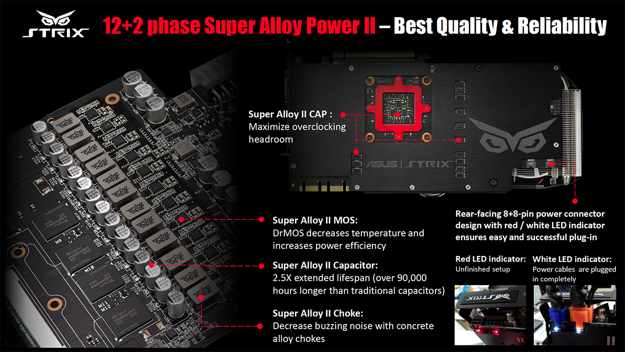Asus have adopted a new way of building their graphics cards – opting for 100% ‘automation' – to remove human error from the production line. Their production is now ‘flux-free'. The 12+2 phase Super Alloy Power II system is designed for maximum reliability and quality.