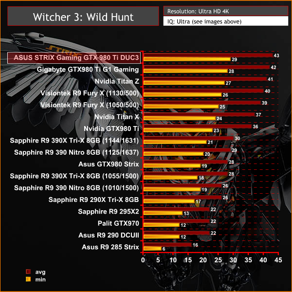 A very tough 4K test with these settings. The ASUS STRIX Gaming GTX 980 Ti DirectCU 3 comes out at top of the chart, averaging 43 frames per second.
