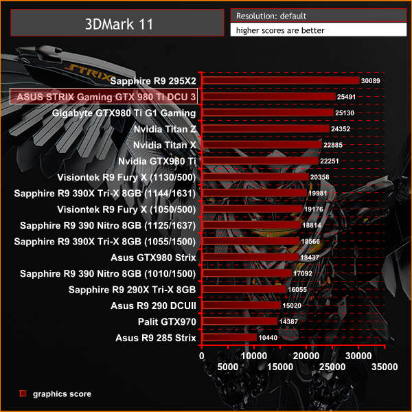 The ASUS STRIX Gaming GTX 980 Ti DirectCU 3 ousts the Gigabyte GTX980 Ti G1 Gaming from second performance position behind the R9 295X2. The final GPU score of 25,491 points is the highest ever from a single GPU.