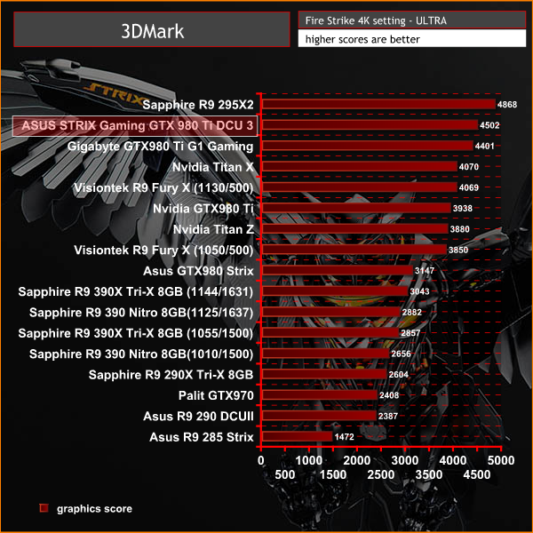 Another great set of results, both at the default settings, and at the ULTRA 4K resolution. The ASUS STRIX Gaming GTX 980 Ti DirectCU 3 tops the chart, behind the R9 295X2.
