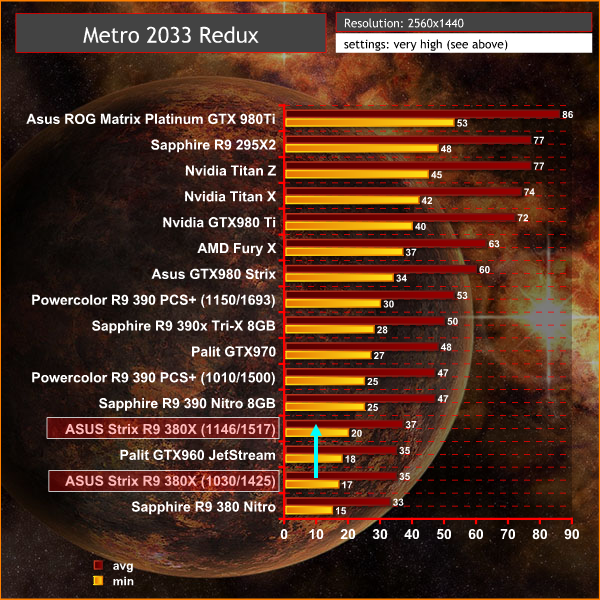 Metro 2033 Redux is a remake of the original game, with enhanced graphics. We often test with Metro Last Light Redux, but decided to mix things around for this review today. We test at 2560×1440 with the following settings: Quality-Very High, SSAA-off, Texture Filtering-16x, Motion Blur-Normal, Tessellation-Normal, Advanced Physx-off.