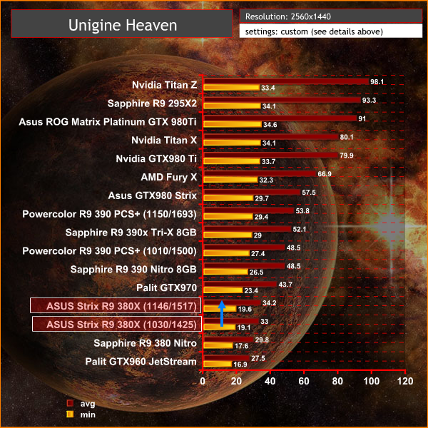 The ASUS Strix R9 380X DirectCU II OC clearly outperforms both R9 380 and overclocked GTX960, but it is some distance behind the GTX970 in this tessellation heavy benchmark.