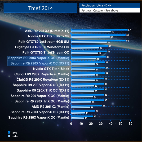 We test at Ultra HD 4k with the HIGH preset, both with Direct X rendering (Nvidia and AMD) and Mantle rendering (AMD only).