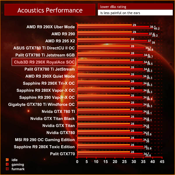The cooler on the RoyalAce card isn't the quietest we have tested, but the noise levels when gaming are not too intrusive – almost identical to output from the Palit JetStream solution on the GTX780Ti.