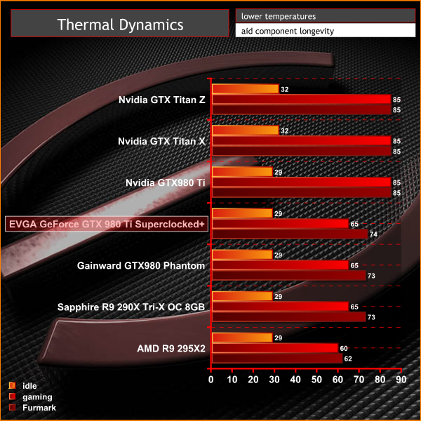 EVGA’s ACX 2.0+ fan turns off below 60°C, generating 0dB of noise.