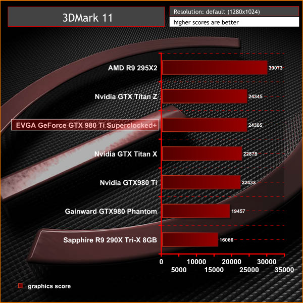 The overall GPU score of 24,305 points places the EVGA GeForce GTX 980 Ti Superclocked+ ACX 2.0+ just behind the Titan Z at reference clock speeds.
