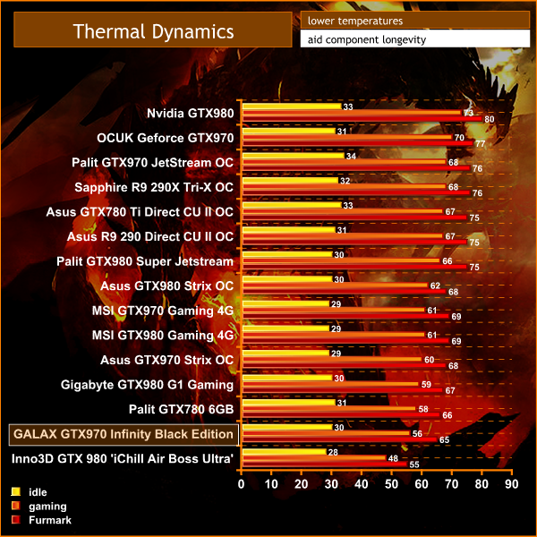 Well this is quite the result. The cooler on the GALAX GeForce GTX 970 OC Silent ‘Infinity Black Edition' card outperforms the cooler fitted to both the Asus GTX970 Strix OC and the MSI GTX970 Gaming 4G. The only cooler which delivers better results is the monstrous ‘iChill Air Boss Ultra' fitted to the Inno3D GTX980.