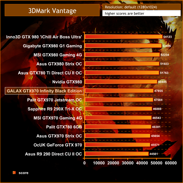 The GALAX GeForce GTX 970 OC Silent ‘Infinity Black Edition' rates very highly, top of the GTX970 chart with a final score of 47,855 points.