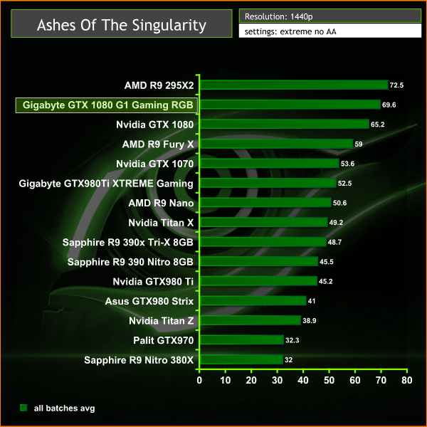 At 1440p the Gigabyte GTX 1080 G1 Gaming RGB is around 4 frames per second faster than the reference Nvidia GTX 1080.