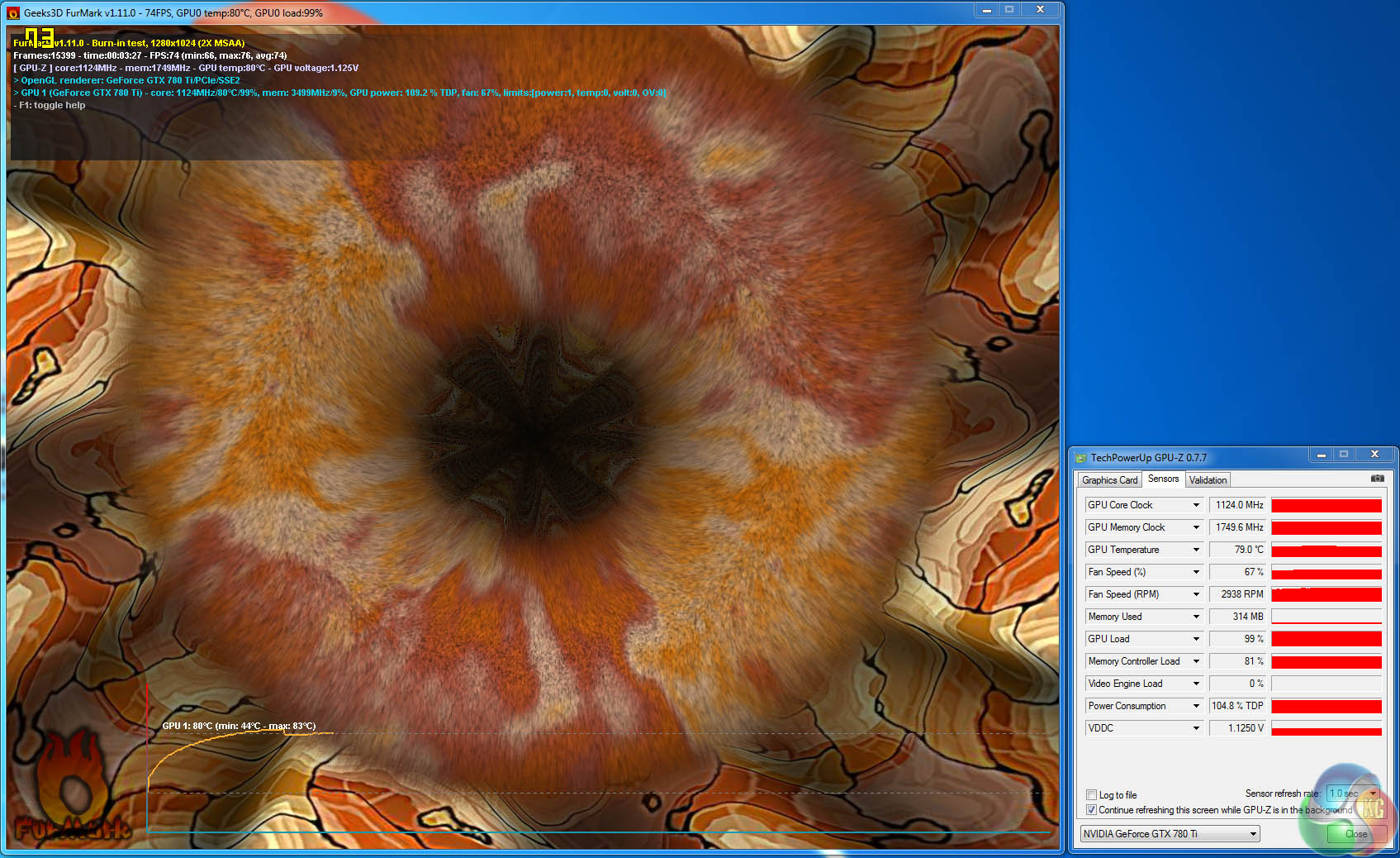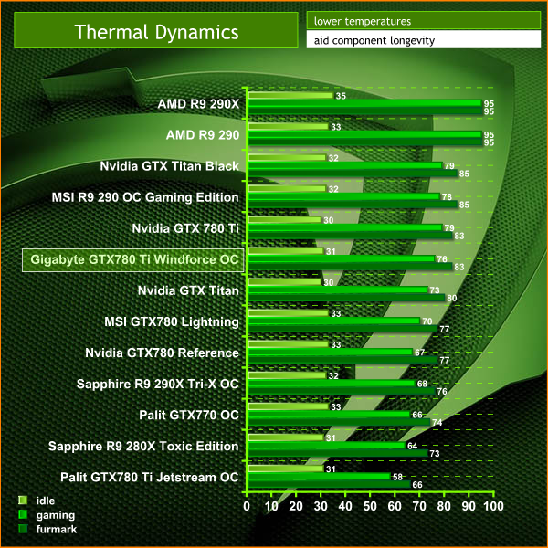 The cooler copes well, hitting mid 70's when gaming in the 24c environment. The Sapphire Tri-X cooler is one of the best we have seen this year, but the Gigabyte Windforce is very good.