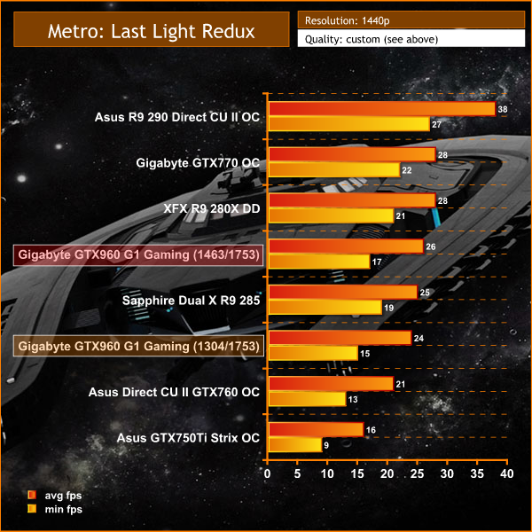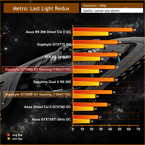 On May 22, 2014, a Redux version of Metro Last Light was announced. It was released on August 26, 2014 in North America and August 29, 2014 in Europe for the PC, PlayStation 4 and Xbox One. Redux adds all the DLC and graphical improvements. A compilation package, titled Metro Redux, was released at the same time which includes Last Light and 2033. (Wikipedia). We test with following settings: quality high, SSAA on, 16AF, Tessellation normal.