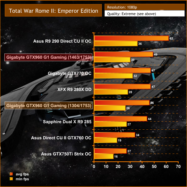 The Gigabyte GTX960 G1 Gaming runs well out of the box, although manually overclocking it to the limit does reap a little reward, improving minimum frame rates from 26 to 30.