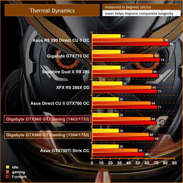 These are good results, although we noticed that the Asus GTX960 Strix OC Edition which we also tested today, runs noticeably cooler. We would therefore assume Gigabyte are putting more voltage through the card, but we will analyse this shortly.
