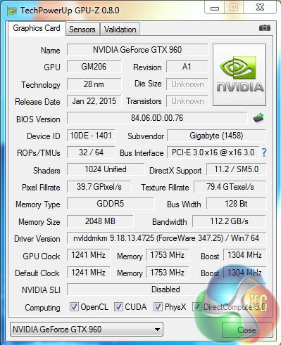 Based on the reference Nvidia specifications of 1,125mhz core and 1,750mhz memory (7Gbps effective) Gigabyte have overclocked the GM206 core by 10.3 percent to 1,241mhz. They have not touched the memory, holding it at 1,753mhz (7Gbps effective). The rest of the hardware we have already discussed on the opening page of this review. The GM206 is built on the 28nm process and it has 32 ROPS, 64 texture units and 1,024 CUDA cores. The 2GB of GDDR5 memory is connected via a 128bit memory interface.