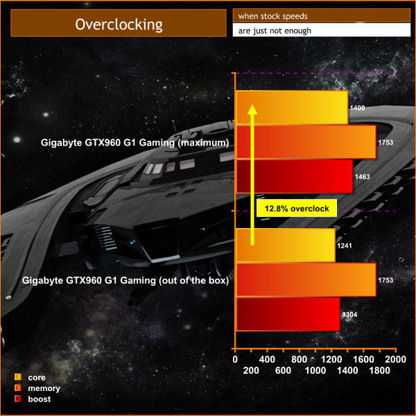 We managed to get the Gigabyte GTX960 G1 Gaming SOC stable with the Boost speed peaking at 1,463mhz. Any higher than this and we noticed some artifacting and eventually hard locking. We had to increase the fan speed a little to get rock stability. Nvidia's reference boost speed is 1,178mhz so this overclock translates into a total 24.1% increase. Not too shabby.
