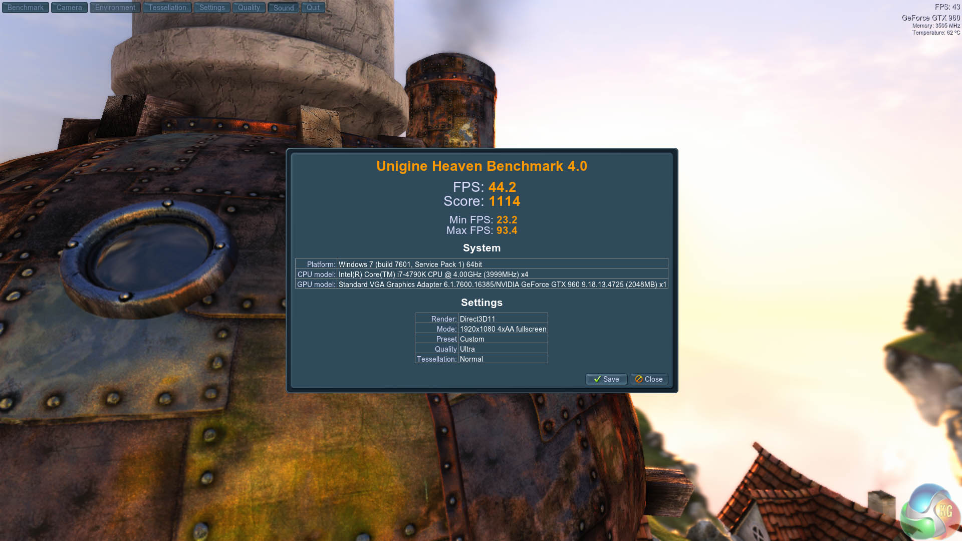 We set Quality to ‘Ultra', Tessellation to ‘Normal', Anti Aliasing to 4 times and the resolution to 1920×1080 (1080p).