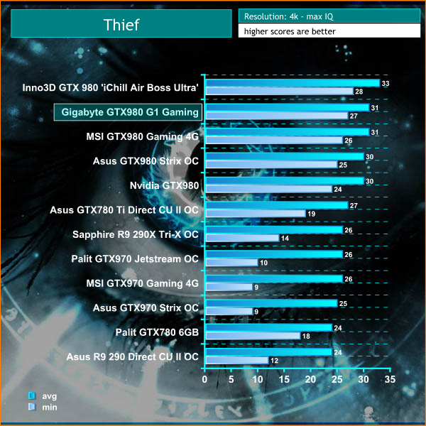 At 4K many people wouldn't be happy with the performance from any of these single card configurations, however the Gigabyte GTX980 G1 Gaming scores quite well, holding an average over 30 frames per second.