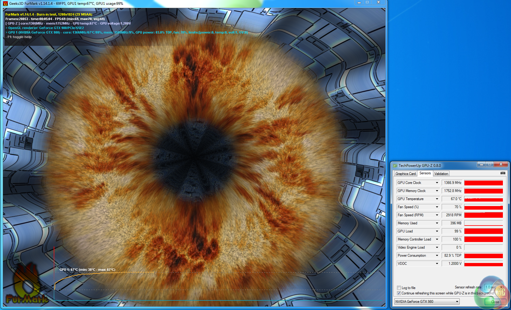 The tests were performed in a controlled air conditioned room with temperatures maintained at a constant 23c – a comfortable environment for the majority of people reading this.Idle temperatures were measured after sitting at the desktop for 30 minutes. Load measurements were acquired by playing Crysis Warhead for 30 minutes and measuring the peak temperature. We also have included Furmark results, recording maximum temperatures throughout a 30 minute stress test. All fan settings were left on automatic.