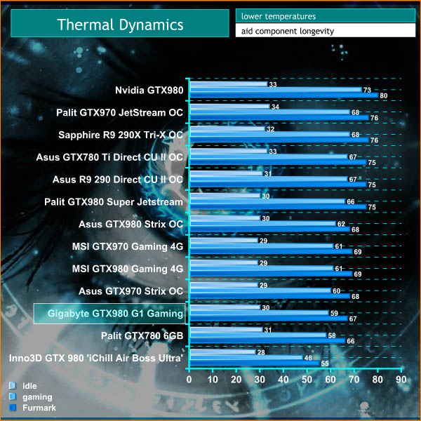 If it wasn't for the incredible cooler fitted to the Inno3D GTX980 ‘iChill Air Boss Ultra' card, the Gigabyte GTX980 G1 Gaming would be claiming our top spot in the cooling department. That said, the cooler managed to outperform both ASUS and MSI solutions – by a single degree.